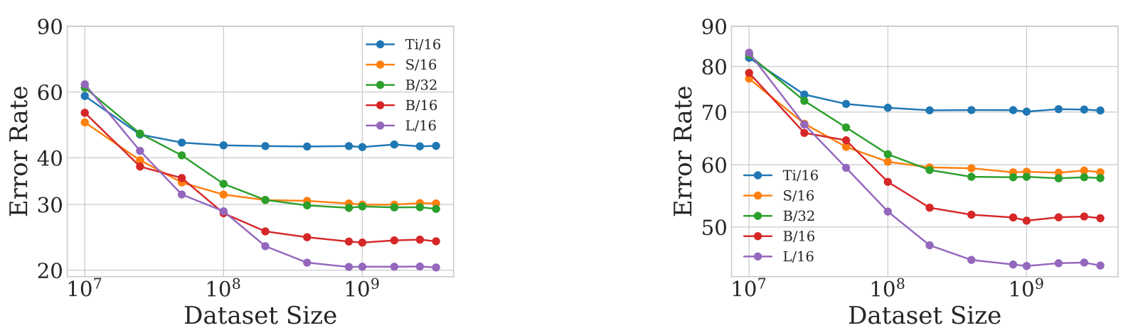 As the dataset size grows, the performance difference between larger ViTs and their smaller counterparts becomes more pronounced. Additiallay, accuracy trends across various datasets (ImageNet-R, ImageNet-Sketch, ImageNet-V2, ObjectNet) were nearly linear, except for ImageNet-A, which had a non-linear improvement, highlighting its challenging nature. (appendix)